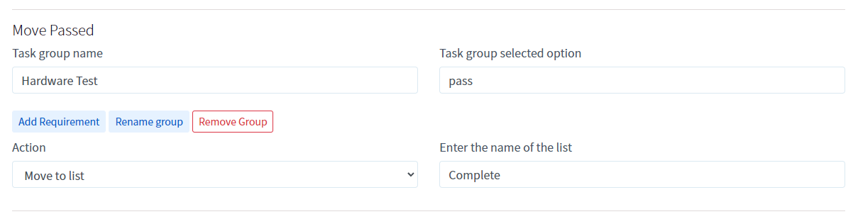 The example below will move the card to the "Complete" list if the engineer selected the option "Check if the hardware test passed" (with identifier: "pass").