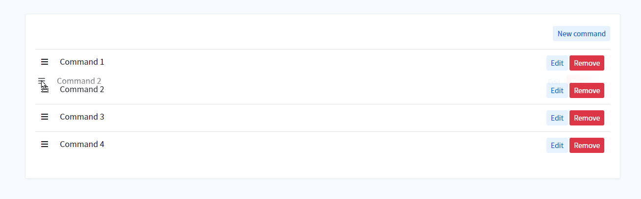 Re-ordering commandsUpdating the order of how your commands are executed is done from the commands overview. To move one, simply drag & drop the command into the right position. To do so, you need to drag at the icon in front of the name.