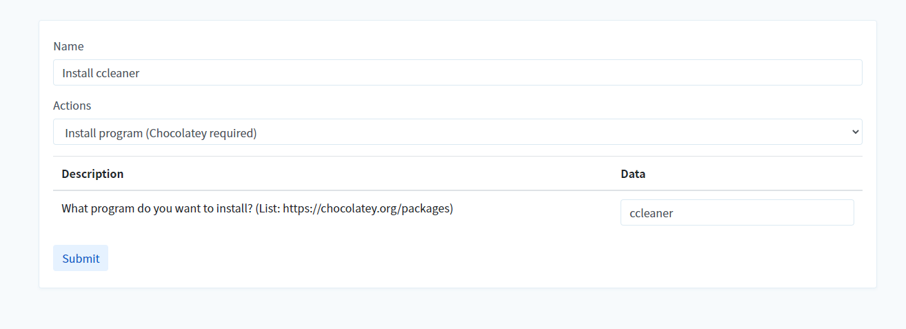 Commands may require parameters, those will be passed into the action. For example, the command "Install program (Chocolatey required)" expects you to provide the name of the software to install.